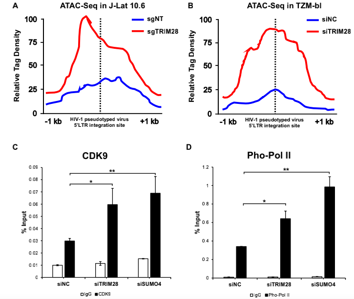 其中,作者通過(guò)ATAC-Seq探究了TRIM28缺失后HIV-1啟動(dòng)子的染色質(zhì)可及性,發(fā)現啟動(dòng)子區的活性顯著(zhù)增強,最終說(shuō)明了RIM28介導的SUMO化損害了CDK9與Cyclin T1的結合能力和CDK9對RNAP II的激酶活性,導致轉錄延伸功能障礙。