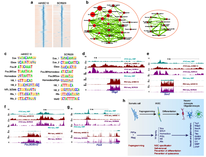 由體細胞重編程的誘導性神經(jīng)干細胞(induced neural stem cells,iNSC)在神經(jīng)疾病的細胞替代療法和體外建模中具有巨大的潛力。已有研究證明將成纖維細胞直接轉化成iNSC的方法依賴(lài)于幾個(gè)關(guān)鍵的神經(jīng)前體細胞轉錄因子(TF),這就提出了一個(gè)問(wèn)題:這種直接的重編程是否可以由非神經(jīng)前體細胞調控TF來(lái)實(shí)現。通過(guò)RNA-seq和ATAC-seq分析結果,作者發(fā)現非神經(jīng)前體細胞調控TFPtf1a可以將小鼠和人的成纖維細胞直接重編程為具有分化出神經(jīng)元、星形膠質(zhì)細胞和少突膠質(zhì)細胞的潛能和自我更新能力的iNSC,并在移植后可以改善阿爾茨海默病小鼠模型的認知功能障礙。相比于MEF,miNSC10和SCR029細胞,Ptf1a重編程的miNSC自我更新和維持所需要的Notch信號通路相關(guān)基因均顯著(zhù)上調,并且這些位點(diǎn)也顯示出差異的ATAC-seq圖譜。說(shuō)明Ptf1a的重編程活性是通過(guò)與Rbpj結合的非Notch信號依賴(lài)途徑,來(lái)維持NSC特化、自我更新和體內穩態(tài)。同時(shí)作者的數據確定了這是一種用于研究和治療的更安全的非典型iNSC。