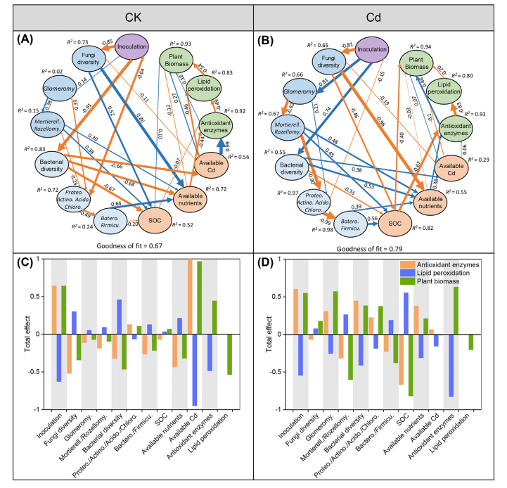 圖5 處理(接種和添加Cd)與微生物群落、土壤特性和植物抗性的級聯(lián)關(guān)系。偏最小二乘路徑模型(PLS-PM)剖析了處理、微生物群落和土壤特性對植物抗性的主要影響途徑(A)(B);以及每個(gè)變量對植物生物量、抗氧化酶和脂質(zhì)過(guò)氧化物的總影響(C)(D)。