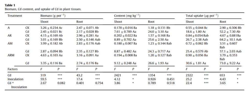 添加Cd和接種根瘤菌以及AMF都顯著(zhù)影響紫花苜蓿生物量,包括芽和根(P<0.01;表1)。此外,接種處理大大提高了紫花苜蓿的芽和根生物量,而添加Cd則顯著(zhù)降低了紫花苜蓿的芽和根生物量(P<0.01)。例如,在添加Cd的根瘤菌和AMF共同接種的處理中,紫花苜蓿生物量最高(3.35±0.116 g /pot)。此外,紫花苜蓿芽和根中的Cd濃度顯著(zhù)受Cd添加、接種及其相互作用的影響。接種和Cd處理大大增加了紫花苜蓿芽和根的Cd吸收含量(表1)。與對照(未接種)相比,所有接種處理下根中的Cd含量均高于芽中的Cd含量(P <0.05)。此外,相對于對照而言,在添加Cd后,接種處理芽中的Cd濃度均高出1.2倍。在添加Cd的共同接種處理中,芽中Cd的總吸收量最高(30.6±1.81mg/pot)。與添加Cd的對照(未接種)相比,單獨接種和共同接種處理的芽中,Cd的總吸收量顯著(zhù)更高(系數分別為1.4和1.6),(P <0.05)。在單獨接種和未接種處理中,根瘤菌和AMF共同接種處理的總Cd吸收量最高。