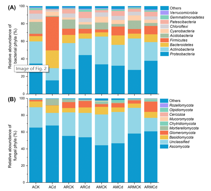 我們的研究在所有不同的處理中檢測到了10個(gè)細菌門(mén)類(lèi)(相對豐度>1%),即變形菌門(mén)(Proteobacteria)、放線(xiàn)菌門(mén)(Actinobacteria)、擬桿菌門(mén)(Bacteroidetes)、厚壁菌門(mén)(Firmicutes)、酸桿菌門(mén)(Acidobacteria)、藍藻細菌門(mén)(Cyanobacteria)、綠彎菌門(mén)(Chloroflexi)、髕骨細菌門(mén)(Patescibacteria)、芽單胞菌門(mén)(Gemmatimonadetes)和疣微菌門(mén)(Verrucomicrobia) (圖2A)。相對豐度<1%的其他種群被歸為”Others”。在所有處理中,Bacteroidetes、Actinobacteria、Proteobacteria和Firmicutes是主要的細菌門(mén)。Cd添加、接種及其相互作用顯著(zhù)影響了Firmicutes、Bacteroidetes和Acidobacteria的相對豐度。特別是Cd的添加,明顯降低了所有接種(AR、AM和ARM)處理中Actinobacteria的相對豐度,而增加了兩個(gè)接種(AM和ARM)處理中Firmicutes的相對豐度。