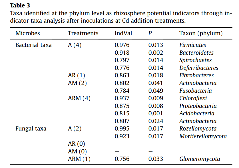 表3 通過(guò)添加Cd處理后的指示性類(lèi)群分析,在門(mén)類(lèi)水平將分類(lèi)群確定為根際潛在指標。