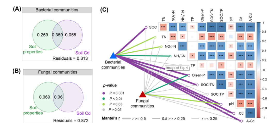 Pearson相關(guān)分析發(fā)現,Cd、OTU和細菌群落的α多樣性指數(即Shannon、Simpson、Chao1和ACE)之間存在顯著(zhù)的相關(guān)性(P<0.05)。除Shannon指數外,SOC、TN、SOC:TN和SOC:TP與OUT以及細菌群落中的這些α多樣性指數之間存在顯著(zhù)的相關(guān)性。但是,除了真菌群落的OTU和Shannon與SOC和SOC:TN外,真菌群落的α多樣性指數與這些土壤性質(zhì)之間沒(méi)有發(fā)現明顯的相關(guān)性。