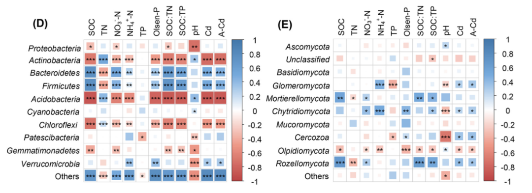 圖4 變異分區分析顯示了細菌(A)和真菌(B)群落解釋的土壤特性和土壤Cd的差異百分比。土壤變量與微生物群落結構之間的關(guān)系(C)。細菌類(lèi)群(門(mén)水平,D)和真菌類(lèi)群(門(mén)水平,E)與土壤特性的相關(guān)熱圖。