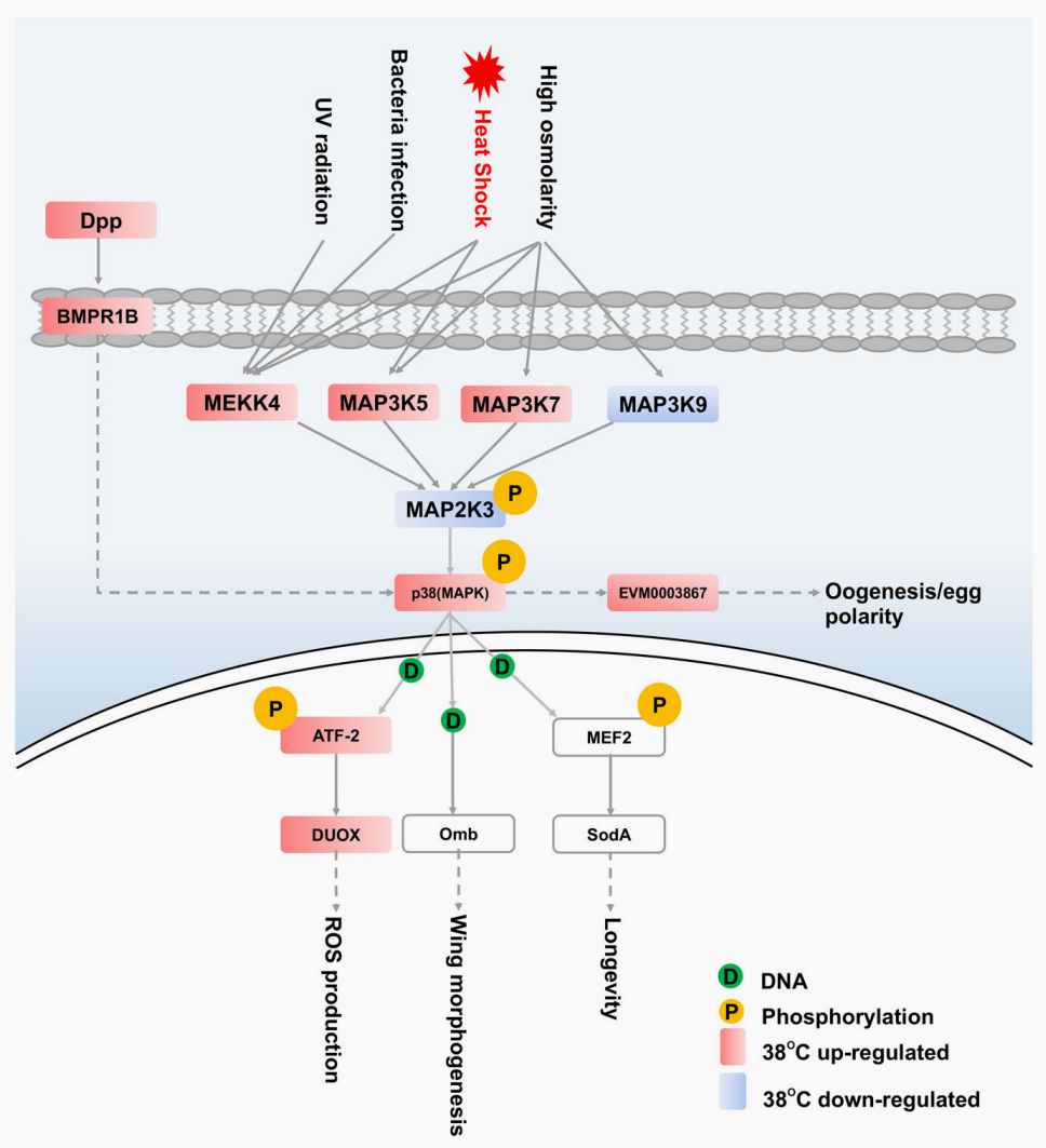 作者進(jìn)一步結合不同逆境條件處理下的轉錄組數據,分析推測出橘小實(shí)蠅中熱休克蛋白的相對穩定高表達是其快速適應逆境的內在機制。并發(fā)現在高溫條件下,p38 MAPK通路關(guān)鍵基因表現為應激性高表達,表明p38MAPK信號通路在橘小實(shí)蠅快速適應新環(huán)境的過(guò)程中發(fā)揮重要作用,并且可能是橘小實(shí)蠅在非生物脅迫下維持穩態(tài)機制的核心。