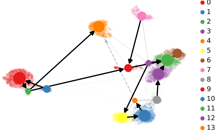 基于RNA-速度的PAGA分析:PAGA提供了軌跡推斷構圖的方法,其中加權邊對應于兩個(gè)集群之間的連接。在這里,PAGA通過(guò)速度推斷的方向性進(jìn)行了擴展。