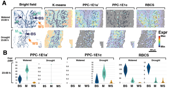 1. 研究人員通過(guò)激光顯微技術(shù)對不同環(huán)境(水分充足及干旱環(huán)境,白天及夜間)葉片進(jìn)行切割區分,獲得葉肉,葉鞘及水分貯藏細胞,進(jìn)行傳統的轉錄組分析,并結合空間轉錄組測序及葉片的組織區分,分析了C4及CAM相關(guān)的差異表達基因,并建立了流量平衡模型,預測了干旱條件下c4 +CAM系統的完整性。
