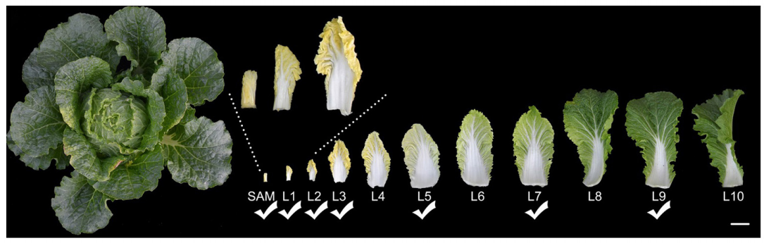在溫室盆栽大白菜,使用11周大的植物進(jìn)行取樣。隨機選擇兩個(gè)正常生長(cháng)的大白菜。從外葉到內葉的所有頭葉(葉長(cháng)>2cm)按順序分離收集,而帶有莖尖分生組織(SAM)的幼葉和小內葉(葉長(cháng)<2cm)不分離,按順序收集。從每個(gè)大白菜頭部共得到30片葉子。從內到外,每3片形態(tài)相似、大小相近的葉子為一葉輪,共得到10葉輪葉。