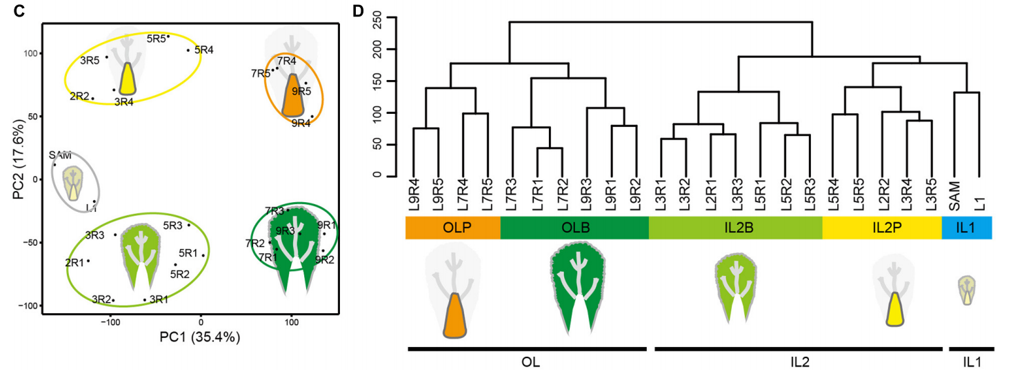 主成分分析(PCA)顯示沿主成分(PC)1和2有明顯的分離。PC1根據與SAM的距離將葉片樣本分開(kāi),而PC2將葉片和葉柄組織分開(kāi)。層次聚類(lèi)分析將樣本分為五類(lèi),與葉子形態(tài)分化一致。SAM和L1的樣本形成內葉1(IL1)最接近莖尖的組織。內葉2的葉片(IL2B)和內葉2的葉柄(IL2P)代表L2-L5的葉片和葉柄組織,而外葉(OLB)和外葉柄(OLP)代表L2-L5的葉片和葉柄組織外葉(L7和L9),與葉子形態(tài)分化一致。