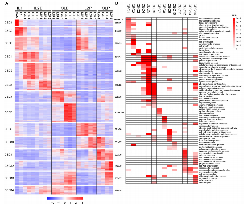 作者在全基因組水平上鑒定了不同葉片中的差異表達基因(DEG),以探索葉片之間的多樣性和潛在功能。通過(guò)分析,共發(fā)現9,133DEG,k-means聚類(lèi)將差異基因分為14個(gè)共表達簇(CEC1-CEC14),這些CEC與圖1中的5個(gè)聚類(lèi)簇緊密相關(guān)。IL1中DEGs的高表達水平以CEC1和2為代表。CEC1在SAM中高度表達,并以與分生組織發(fā)育、組織發(fā)育和近軸/遠軸極性相關(guān)的基因為代表。CEC2在SAM和L1高表達,包含與細胞分裂、細胞增殖、細胞生長(cháng)和生長(cháng)素生物合成過(guò)程相關(guān)的基因。IL2B中DEG的高表達水平以CEC4-6為代表。CEC4、5和6均富集于有機酸代謝過(guò)程、淀粉代謝過(guò)程、質(zhì)體組織和硫苷代謝、光合光反應等過(guò)程。IL2P中DEGs的高表達以CEC9為代表。CEC9富含植物細胞壁相關(guān)過(guò)程,包括壁組織或生物發(fā)生,以及果膠代謝過(guò)程。OLB中DEGs以CEC7和8為代表。CEC7在L7葉片中高表達,并以與蛋白質(zhì)修飾過(guò)程、蛋白質(zhì)磷酸化和蛋白質(zhì)絲氨酸/蘇氨酸激酶活性相關(guān)的基因為代表。這些結果反映L7具有明顯的信號轉導和基因調控特征。CEC8在L9葉片中高表達,含有一組與葉綠素分解代謝過(guò)程、細胞分解代謝過(guò)程、防御反應調節、果糖反應和脫落酸激活信號通路相關(guān)的基因。OLP中DEG的高表達水平以CEC11和12為代表。CEC11中的基因在L7-L9的葉柄中高度表達,在任何基因本體(GO)術(shù)語(yǔ)中均未富集。CEC12中的基因在L9的葉柄中高度表達。這些基因可能主要參與脫落酸激活的信號通路、茉莉酸(JA)代謝過(guò)程、JA反應、防御反應、生物刺激反應、水楊酸反應和外部刺激反應。這些結果表明,L9可能在保護多葉頭部免受外部損害方面發(fā)揮作用。