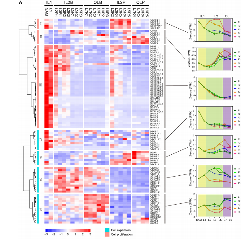 作者鑒定了細胞增殖相關(guān)基因和細胞擴張相關(guān)基因。結果表明,大多數細胞增殖基因在IL1HLs中達到峰值,包括SAM和L1,但在IL2HLs和外HLs中迅速下調(圖3A),表明細胞增殖基因在不斷生長(cháng)的內葉的起始過(guò)程中發(fā)揮重要作用。與細胞增殖基因不同,大部分細胞擴張基因在IL2HLs和外HLs的葉片區域高表達,且表達模式更為多樣,分為4個(gè)簇(圖3A)。此外,大部分細胞擴張基因在IL2HLs和外層HLs之間表現出不同的表達模式,導致L7細胞分裂和細胞擴張調控的變化明顯高于IL2HLs和外層葉(圖3B)。