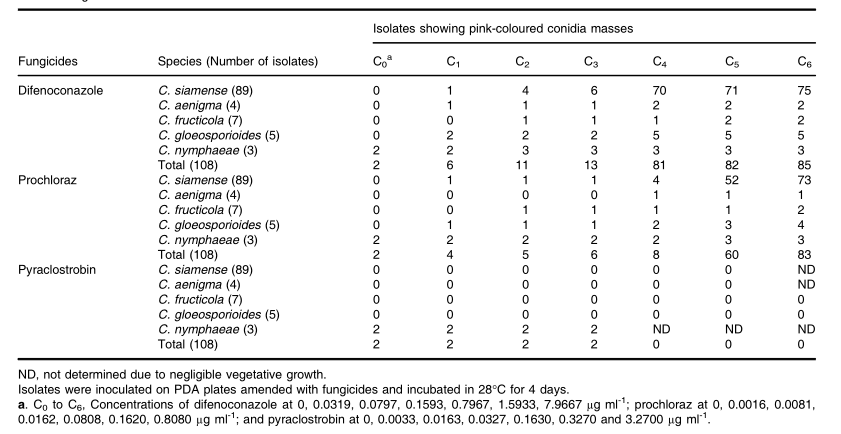 4、從5種炭疽菌中選取20個(gè)代表性菌株評估殺菌劑脅迫對分生孢子產(chǎn)量的影響:包括 5個(gè)C. siamense, 4個(gè)C.?gloeosporioides, 4個(gè)C. fructicola, 4個(gè)C. aenigma和3個(gè)C. nymphaeae。