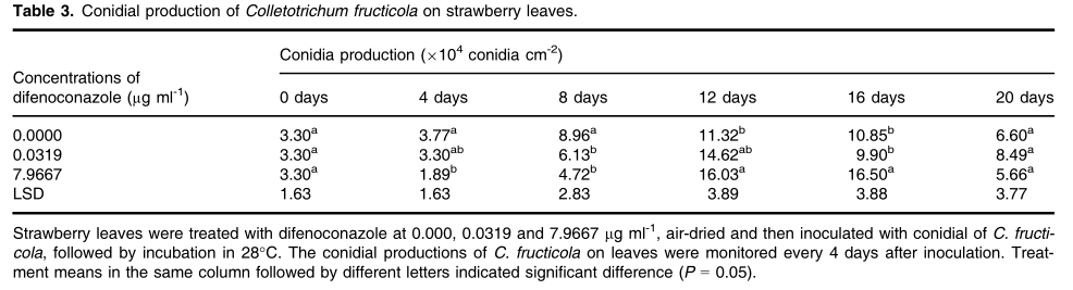 2.苯醚甲環(huán)唑對炭疽菌在草莓葉片上產(chǎn)孢的影響