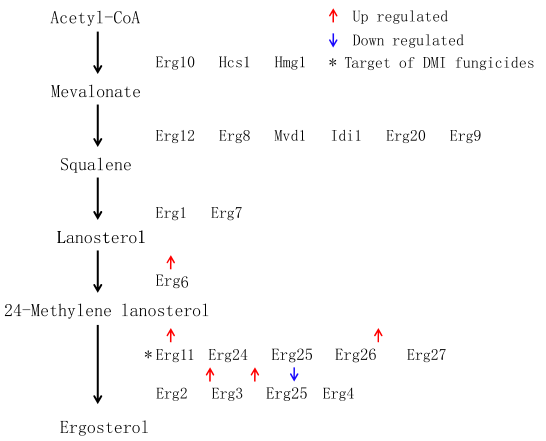 在真菌中,麥角甾醇是由乙酰輔酶A(乙酰輔酶A)通過(guò)復雜途徑合成的。釀酒酵母中的麥角甾醇生物合成步驟研究較為透徹,共有21個(gè)基因參與麥角甾醇生物合成。我們從C. fructicola中找到了相關(guān)同源基因。在苯醚甲環(huán)唑脅迫下,在參與麥角甾醇生物合成的基因中,與對照相比, Erg11(DMI殺菌劑的靶標,在真菌中被稱(chēng)為CYP51)基因被發(fā)現上調。Erg6、Erg27、Erg3和Erg5基因表達量也上調。與對照組相比,Erg4基因受到抑制。苯醚甲環(huán)唑處理后,其他15個(gè)基因的表達水平?jīng)]有顯著(zhù)變化。說(shuō)明:DMI類(lèi)殺菌劑對炭疽菌產(chǎn)孢的促進(jìn)作用可能與麥角甾醇合成途徑中基因表達量的變化及甾醇種類(lèi)變化有關(guān)。