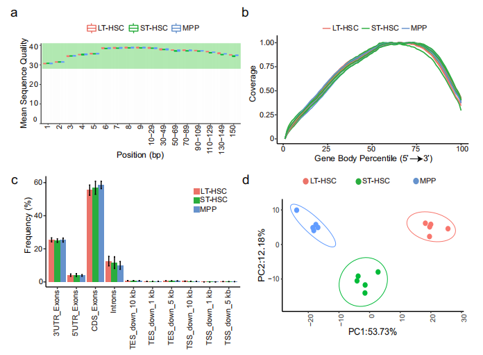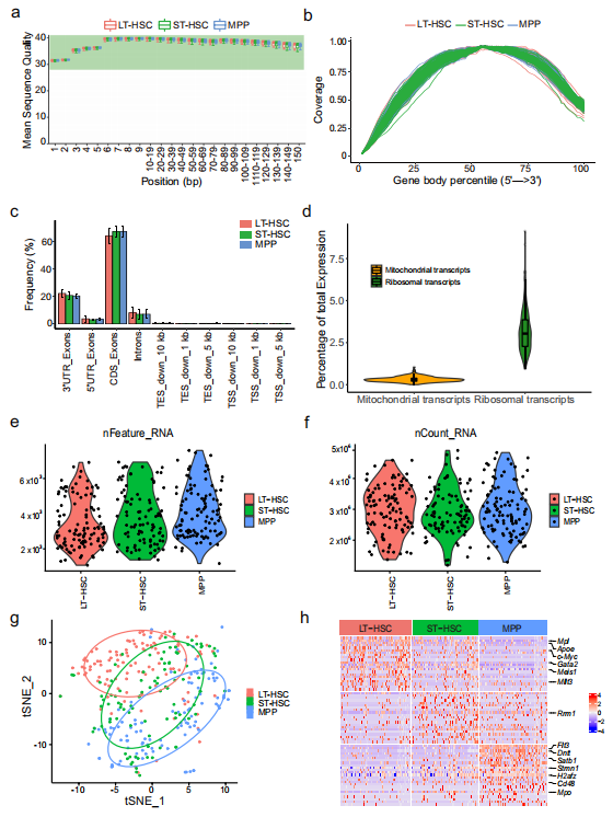 樣本制備:8-9周的雌性成年C57BL/6 J 小鼠,從股骨和脛骨中分離骨髓細胞。首先使用小鼠造血干細胞分離試劑盒富集造血干細胞和祖細胞(HSPC)。長(cháng)期(LT)和短期(ST)造血干細胞(HSC)和多能祖細胞(MPP)根據其表面標志物進(jìn)行分選。對于單細胞RNA測序(scRNA-seq),將細胞單獨分選到含有裂解緩沖液的8條PCR管中。同時(shí)對于批量RNA-seq,分選100個(gè)細胞(P100)到一個(gè)PCR管中作為生物學(xué)重復。