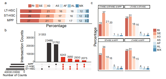 轉錄和轉錄后的調控在平衡造血干細胞的結構性和低水平周轉、下游分化和造血重建方面都是關(guān)鍵。在多細胞生物中,可變剪接是一種關(guān)鍵的轉錄后調控機制,可以擴大轉錄本的多樣性。越來(lái)越多的研究表明,在造血過(guò)程中,可變剪接模式是必不可少的。例如,在血液祖細胞或巨核細胞和紅細胞譜系中鑒定到的特異性可變剪接事件。研究發(fā)現,關(guān)鍵造血調節因子(如HMGA2)的可變剪接模式影響了造血干細胞的分子鑒定。此外,異常AS是包括白血病等各種癌癥的標志物。