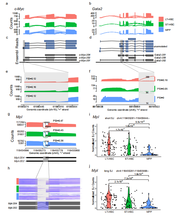 為了進(jìn)一步確認長(cháng)讀長(cháng)在識別可變剪接異構體方面的優(yōu)勢,使用納米孔和PacBio測序數據對三種細胞類(lèi)型中已知的LT-HSC的標志物c-Myc和Gata2(圖2h)的轉錄本進(jìn)行了可視化。接下來(lái)篩選了所有映射到基因c-Myc和Gata2及其注釋的轉錄本上的reads。發(fā)現2915個(gè)reads覆蓋到了c-Myc,且LT-HSC的reads數*多(圖6a)。在納米孔和PacBio測序數據中可視化了全長(cháng)轉錄本的reads,發(fā)現所有注釋的亞型都能被鑒定識別(圖6c)。在c-Myc第一個(gè)外顯子中發(fā)現了一個(gè)5 ‘的可變剪接起始位點(diǎn)。使用短讀長(cháng)測序數據來(lái)定量該基因座的剪接百分比(PSI),發(fā)現較長(cháng)的異構體在所有三種細胞類(lèi)型中具有相似的 PSI(剪接百分比),ST-HSC中包含第一個(gè)外顯子的較長(cháng)異構體的reads占比比較高(圖6 e)。對于Gata2來(lái)說(shuō),發(fā)現覆蓋有595個(gè)reads,在LT-HSC中比其他兩種細胞類(lèi)型多了近20倍的reads數(圖6b)。通過(guò)對比全長(cháng)reads和注釋的轉錄本,發(fā)現在LT-HSC中Ensembl的轉錄本中有一個(gè)未注釋的內含子保留(圖6d)。隨后利用短讀長(cháng)測序數據驗證驗證了這種內含子保留并定量這個(gè)內含子的PSI值,發(fā)現該內含子在LT-HSC中PSI值*高(圖6f)。接下來(lái)展示將長(cháng)讀長(cháng)測序與單細胞RNA-seq結合的數據示例,從長(cháng)讀長(cháng)測序數據中鑒定到了一個(gè)在Mpl中具有24 bp可變剪接區域的可5’剪接位點(diǎn)(A5)?;赟mart-seq2的測序數據發(fā)現這個(gè)剪接事件在不同細胞類(lèi)型中是差異的,其PSI值從LT-HSC,ST-HSC到MPP是依次遞減的(圖6g-j)。使用Smart-seq2數據可以觀(guān)察到單個(gè)細胞間的異質(zhì)性(圖6h),在造血過(guò)程中,所涉及的長(cháng)和短剪接位點(diǎn)(SJ)是被顯著(zhù)下調的(圖6i,j)。這些結果表明,整合短讀長(cháng)和長(cháng)讀長(cháng)測序有助于識別差異表達的異構體。