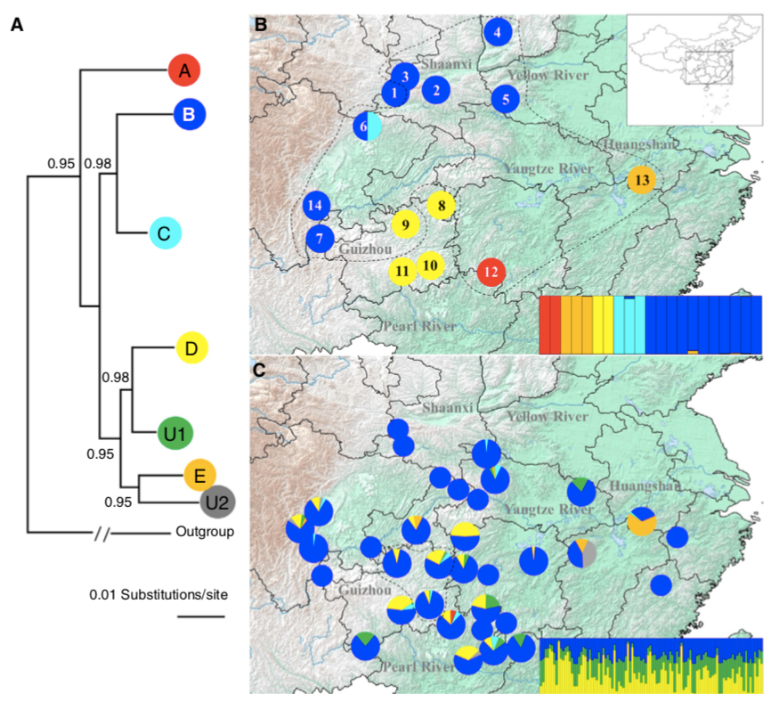 此外,2018年發(fā)表在Current Biology(IF = 10.814)的中國大鯢研究中,研究人員收集了70個(gè)野生地采集的1034個(gè)個(gè)體,通過(guò)SLAF-seq對中國大鯢的分類(lèi)進(jìn)行研究?;?3,159個(gè)SNPs位點(diǎn)和mtDNA的野生采集個(gè)體的遺傳多樣性分析顯示:中國大鯢至少具有5個(gè)明顯的分群(圖3)。此外還有一些未被鑒定的種(圖3:U1,U2)。譜系A-E,在4.71-10.25Mya間開(kāi)始分化,并與河流排水相關(guān)?;谵r場(chǎng)育種的中國大鯢個(gè)體的mtDNA和微衛星序列的遺傳多樣性分析顯示其具有廣泛的遺傳混合,特別是,漸滲種類(lèi)B來(lái)自陜西黃河流域。通過(guò)農業(yè)混種導致了分化于四百萬(wàn)年前的中國大鯢發(fā)生了雜交,這種雜交方式不足為奇,另有研究報道過(guò)在日本本土,中國大鯢的引種和日本大鯢發(fā)生了雜交。