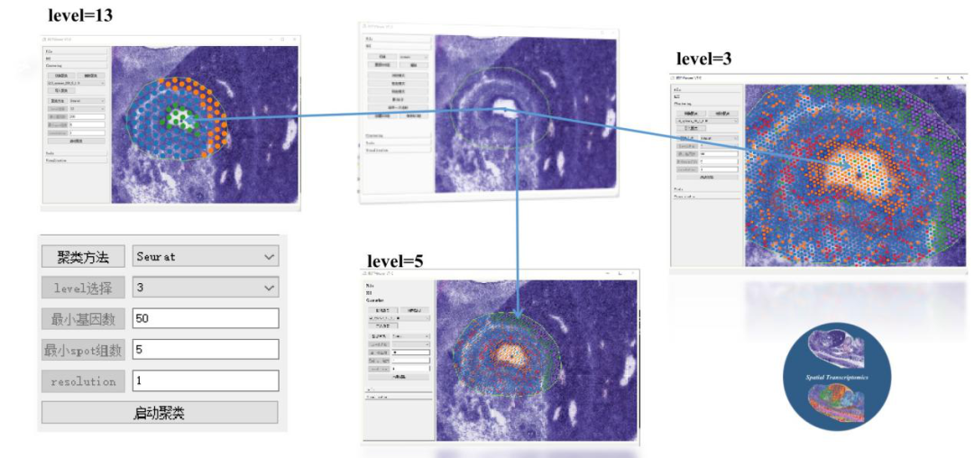 研發(fā)的百創(chuàng )S1000數據分析流程和工具軟件包:BSTMatrix可用于空間表達矩陣獲取兼容下游第三方軟件分析,亞細胞分辨率supspot level實(shí)現100μm~5μm多級分辨率數據挖掘分析,高效便捷在線(xiàn)可視化BSTViewer助你輕松獲取不同分辨率下可視化結果。