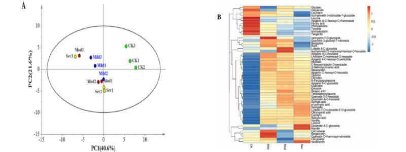 Fig 2 采用主成分分析法(A)和層次聚類(lèi)分析法(B)對不同程度油斑病青檸檬的初級代謝產(chǎn)物進(jìn)行分析