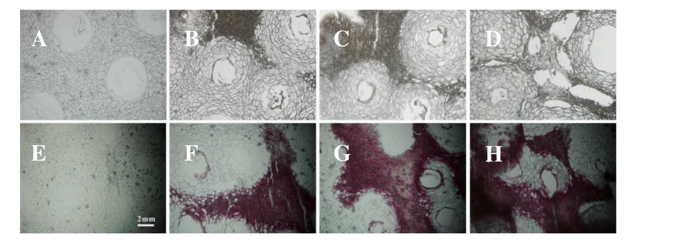 為了從形態(tài)學(xué)角度揭示油斑病對檸檬皮中木質(zhì)素積累的影響,采用間苯三酚-鹽酸反應對健康和油斑病檸檬皮的橫截面進(jìn)行了木質(zhì)素化研究。在染色前,健康檸檬皮的細胞排列整齊,沒(méi)有塌陷,而輕度油斑病檸檬皮的細胞似乎塌陷并堆積在一起。隨著(zhù)油斑病嚴重程度的增加,細胞的堆積越來(lái)越明顯,細胞間組織的塌陷導致不同程度的破裂,特別是在油斑病嚴重的檸檬皮中,可以觀(guān)察到許多裂痕洞(Fig. 4)。