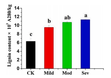 為進(jìn)一步證實(shí)油斑病對檸檬皮中木質(zhì)素積累的影響,測定了不同油斑病程度檸檬皮中木質(zhì)素含量。結果表明,油斑菌病顯著(zhù)提高了木質(zhì)素含量,且呈程度依賴(lài)性。中度油斑病檸檬皮與輕度和重度油斑病的檸檬皮的木質(zhì)素含量無(wú)顯著(zhù)差異。與對照組相比,輕度、中度和重度油斑病的檸檬皮中總木質(zhì)素含量分別顯著(zhù)增加了51.2%、69.7%和79.6%(Fig. 5),這與染色結果一致。