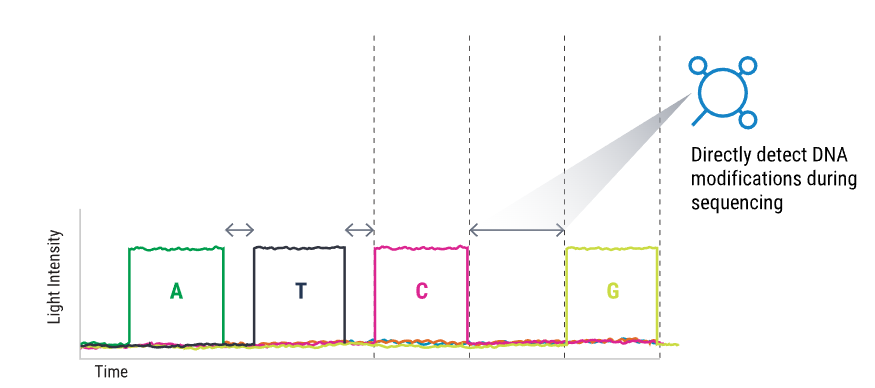 PacBio平臺主要通過(guò)DNA聚合酶與模板鏈結合,在鏈合成的過(guò)程中,不同熒光標記的堿基會(huì )釋放不同的熒光信號,根據光的波長(cháng)與峰值從而判斷堿基類(lèi)型與順序。聚合酶合成中每個(gè)堿基間都存在時(shí)間間隔,當模板堿基有修飾時(shí),兩個(gè)相鄰的脈沖峰之間的距離就會(huì )延長(cháng)。當IPD比例(兩個(gè)相鄰的脈沖峰之間的距離和參考序列距離的比值)明顯大于1 時(shí),可推斷這個(gè)位置存在修飾。