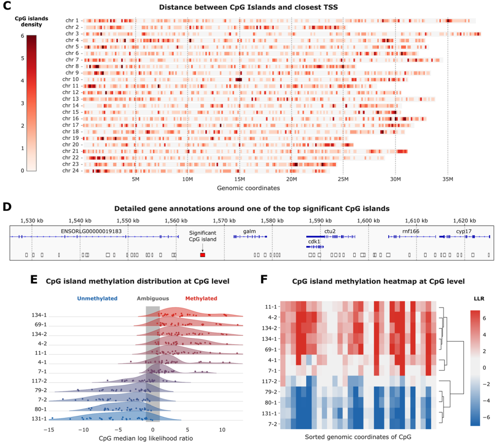 - E面板D中突出顯示的CpG島的CpG水平對數似然比核密度圖。通過(guò)降低中值llr,在Y軸上對樣本進(jìn)行排序。單個(gè)CpG值由點(diǎn)表示。