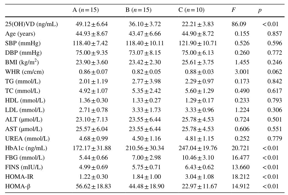 為了進(jìn)一步了解維生素D缺乏對葡萄糖代謝的影響,根據空腹血糖值對每組樣本進(jìn)行細分,進(jìn)行亞組分析。如表2所示,A組有8例空腹血糖<5.6mmoL/L,7例空腹血糖<≤7.0mmoL/L。B組2例Fbg<5.6mmoL/L,10例Fbg<5.6mmoL/L,3例Fbg≥7.0mmoL/L,C組3例Fbg<Fbg≤7.0mmoL/L,7例Fbg≥7.0mmoL/L,表明維生素D缺乏可導致高血糖和糖代謝異常。