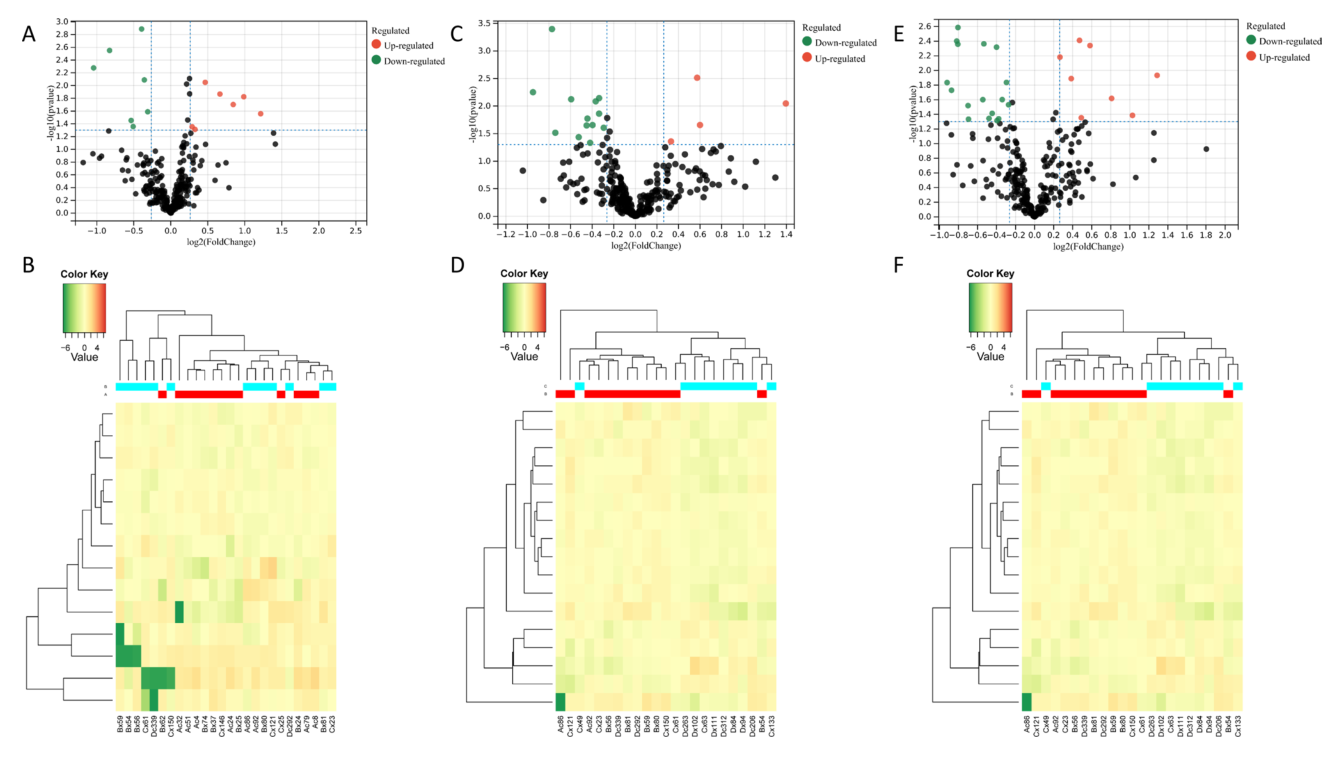 對三組蛋白質(zhì)樣本進(jìn)行了PCA分析(圖1)。蛋白質(zhì)組差異分析用于分析維生素缺乏對補體差異蛋白的影響。如火山圖(A?vs B)所示,隨著(zhù)維生素D含量的降低,7種蛋白質(zhì)的表達水平上調,7種蛋白質(zhì)的表達水平下調(圖2A),如補體因子B(CFB)、原肌球蛋白α-4鏈(TPM4)和可誘導共刺激分子配體(ICOSL)。A組和B組熱圖分析結果顯示兩組之間有很好的分離(圖2B)。