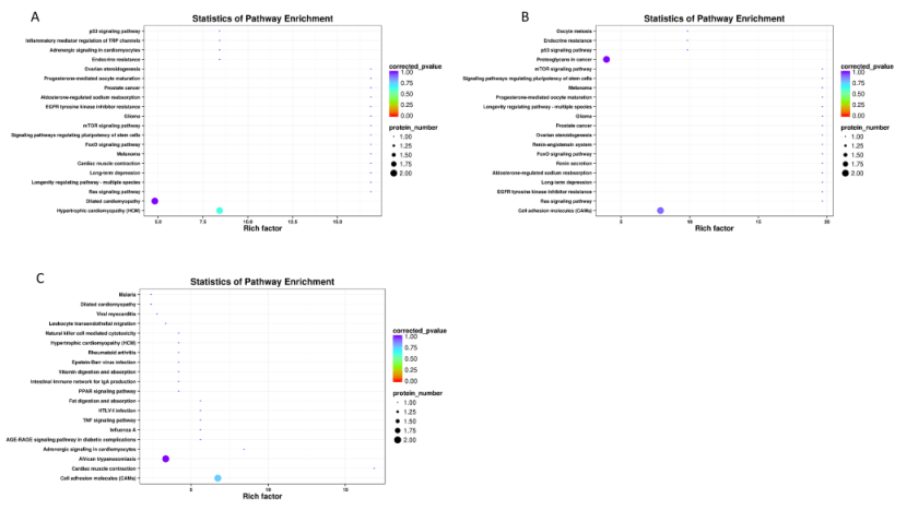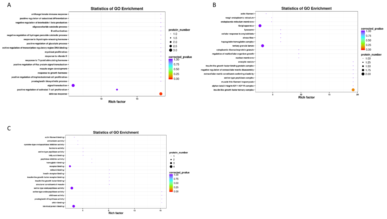為了進(jìn)一步探索差異蛋白的潛在功能,我們進(jìn)行了GO分析。GO功能分析顯示,A組和B組之間差異表達的蛋白質(zhì)主要與“胰島素受體結合”、“防御反應”、“積極調節活化的T細胞增殖”和“細胞對淀粉樣β蛋白的反應”有關(guān)(圖3)。與C組相比,B組與C組差異表達的蛋白質(zhì)主要集中在“活化T細胞增殖的正向調節”、“胰島素樣生長(cháng)因子結合蛋白復合體”和“維生素D結合”(圖4,見(jiàn)原文)。與C組相比,A組差異表達的蛋白質(zhì)主要集中在“防御反應”、“免疫突觸”和“胰島素樣生長(cháng)因子結合”(圖5,見(jiàn)原文)。這些結果表明,差異蛋白廣泛參與免疫功能和胰島素分泌。