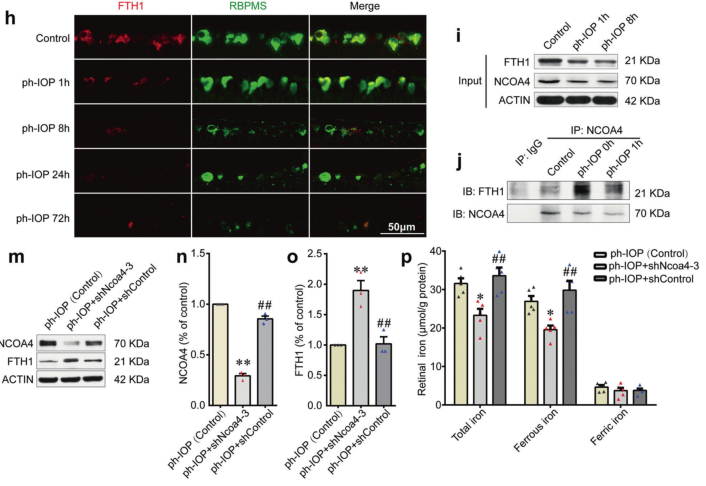 3. 進(jìn)一步研究發(fā)現,核受體共激活劑4(NCOA4)介導的鐵蛋白重多肽1(FTH1)的降解是導致ph-IOP損傷后視網(wǎng)膜內鐵代謝紊亂的重要原因,體內敲低Ncoa4的表達可抑制FTH1的降解,并降低視網(wǎng)膜中二價(jià)鐵的水平;