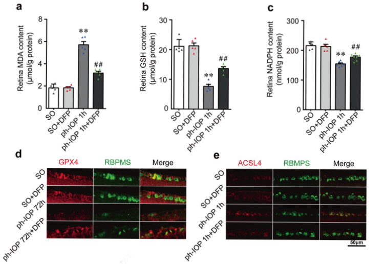 去鐵酮DPF作為鐵螯合劑目前已應用于臨床治療鐵超負荷疾病,阻止患者血清鐵的蓄積。進(jìn)一步研究DFP對ph-IOP損傷小鼠鐵代謝的影響。體內體外結果顯示,DFP處理可以顯著(zhù)降低 ph-IOP誘導的視網(wǎng)膜二價(jià)鐵累積;DFP治療可降低ph-IOP損傷后視網(wǎng)膜MDA含量(圖4a),增加GSH和NADPH水平(圖5b, c );此外,在ph-IOP損傷小鼠中,DFP處理恢復了GPX4水平,并降低了ACSL4水平(圖5d-e)。以上結果表明,DFP可以改善ph-IOP誘導的視網(wǎng)膜鐵死亡。