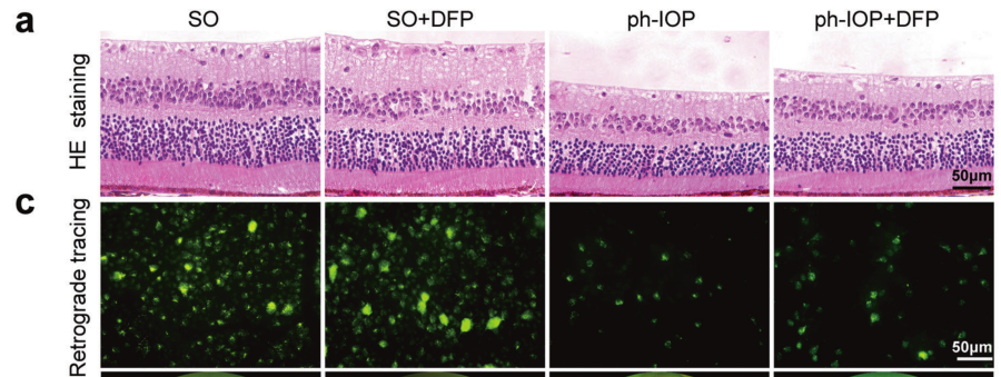 H&E染色結果顯示,Ph-IOP損傷導致顯著(zhù)的RGC丟失和視功能損害;接著(zhù)從形態(tài)學(xué)和功能上驗證了DFP對RGC的藥理作用,在 ph-IOP 損傷后5天,DFP處理減弱了神經(jīng)節細胞復合體(GCC)厚度,并增加了RGC數量(FG標記RGC形態(tài))。這些結果表明,DFP在ph-IOP損傷后保護 RGC 損傷,因此使用DFP抑制鐵死亡是治療ph-IOP誘導的RGC 損失的有效治療策略。