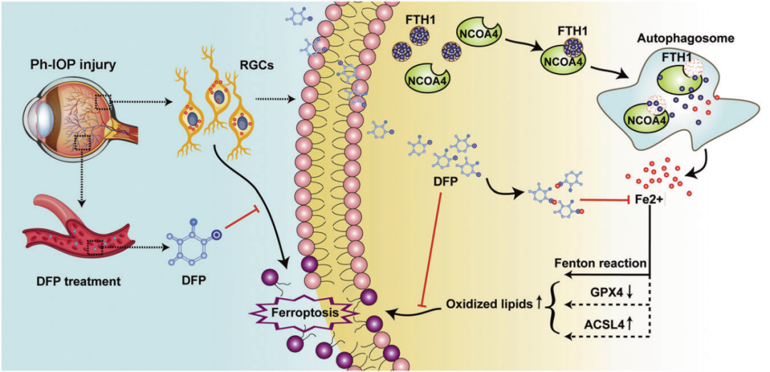 在生理狀態(tài)下,細胞內鐵處于動(dòng)態(tài)平衡狀態(tài),但在病理狀態(tài)下,這種平衡會(huì )被打破。Ph-IOP 損傷可以激活RGC細胞內的NCOA4,激活的NCOA4將結合FTH1并觸發(fā)溶酶體降解FTH1(稱(chēng)為鐵自噬)。降解的FTH1會(huì )釋放大量的游離鐵離子,這種具有氧化還原活性的金屬會(huì )進(jìn)一步參與脂質(zhì)過(guò)氧化。最終,由鐵引起的脂質(zhì)過(guò)氧化氫的積累導致RGC鐵死亡,但口服DFP可以螯合細胞內多余的游離鐵離子,抑制ph-IOP誘導的RGC鐵死亡。