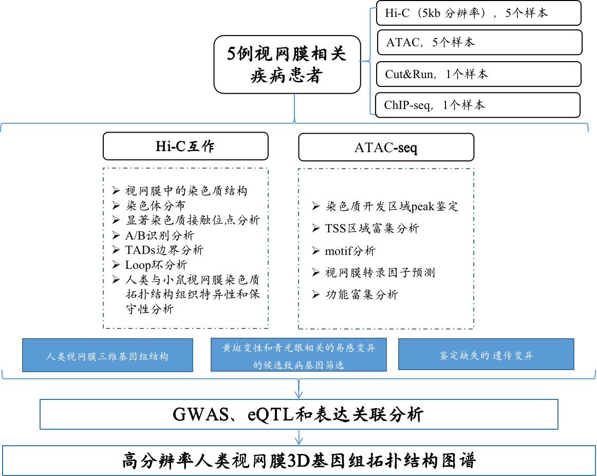 在過(guò)去視網(wǎng)膜疾病的全基因組關(guān)聯(lián)研究(GWAS)發(fā)現常見(jiàn)的變異主要在基因組非編碼區域,但由于先導變異區域的局部連鎖不平衡(LD),阻礙了特定關(guān)聯(lián)基因和變異的識別,因此闡明與性狀相關(guān)的遺傳變異如何影響調節基因表達網(wǎng)絡(luò ),并因此影響表型,亟需了解相關(guān)組織和細胞類(lèi)型的3D基因組拓撲結構。