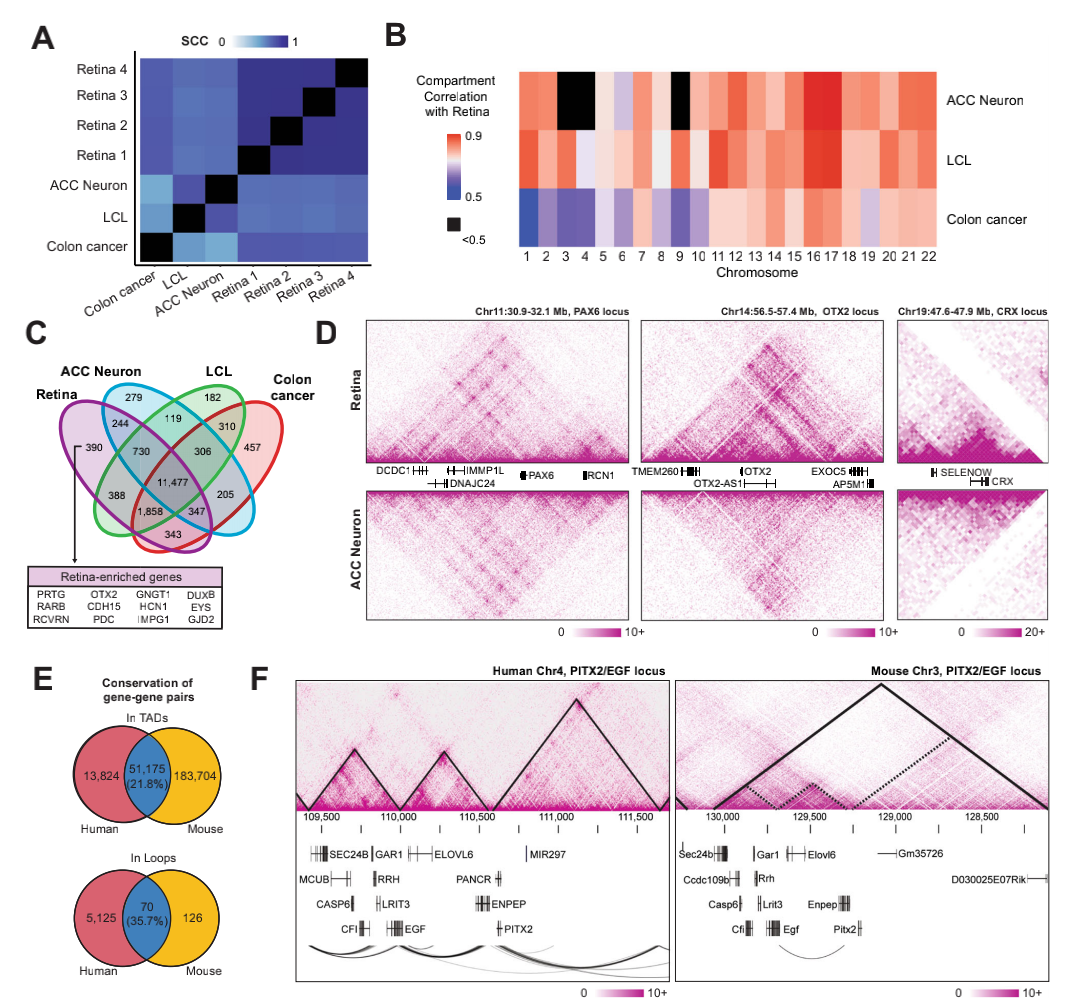 為了評估已識別的染色質(zhì)特征在人視網(wǎng)膜組織特異性和物種保守性,這里比較了人類(lèi)神經(jīng)元(ACC)、GM12878淋巴細胞(LCL)、結腸癌細胞(HCT116,clone cancer)Hi-C測序數據,發(fā)現視網(wǎng)膜特異性基因,如OTX2、EYS、PDC,只存在于視網(wǎng)膜的A component;由于視網(wǎng)膜和ACC神經(jīng)元之間的高度相關(guān)性,比較發(fā)現PAX6基因座在神經(jīng)元和視網(wǎng)膜中的相互作用與其在兩個(gè)組織中的表達相似,而編碼OTX2和CRX兩個(gè)關(guān)鍵的視網(wǎng)膜TF,在視網(wǎng)膜中表現出大量的局部相互作用,但在神經(jīng)元中沒(méi)有,表明人視網(wǎng)膜組織拓撲關(guān)聯(lián)域具有組織特異性,并在基因調節中發(fā)揮著(zhù)重要作用。