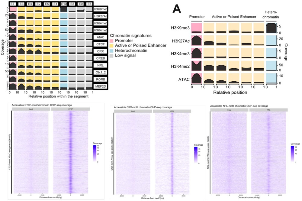 染色質(zhì)互作形成的loops促進(jìn)CRE與其目標基因之間的物理相互作用,并且在控制基因表達方面發(fā)揮著(zhù)至關(guān)重要的作用。為了識別視網(wǎng)膜CRE,利用染色質(zhì)可及性檢測(ATAC-seq)確定了染色質(zhì)開(kāi)放狀態(tài)和CUT&Run檢測活性(H3K4me3,H3K27Ac,H3K4me234)和抑制性(H3K9me3)組蛋白標記互作的特征序列。通過(guò)全基因組染色質(zhì)開(kāi)放程度以及開(kāi)放區域(啟動(dòng)子、增強子、異染色質(zhì)、低豐度信號)構建了10種染色質(zhì)狀態(tài)模型,啟動(dòng)子和增強子區域富集了用于結合CTCF和關(guān)鍵視網(wǎng)膜TF,如CRX、NRL、OTX2、MEF2D、CREB和RORB,另外增強子主要在TSS上游區域富集,而啟動(dòng)子僅在TSS富集。