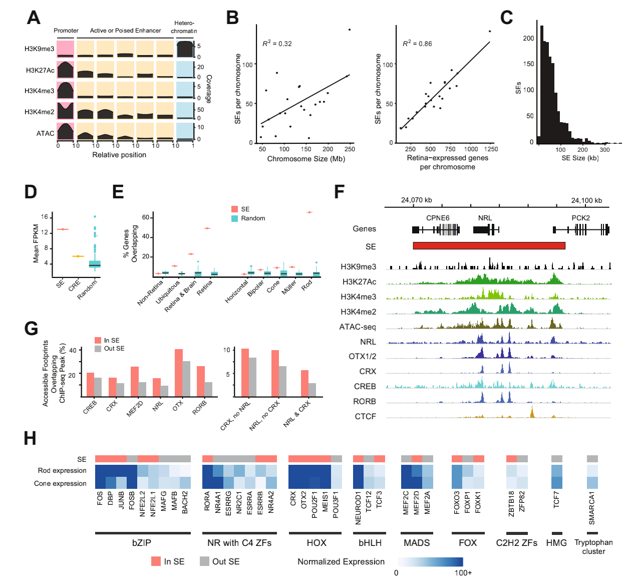 利用H3K27Ac蛋白標記互作在視網(wǎng)膜順式調控元件啟動(dòng)子和活性或穩定增強子區域鑒定了1325個(gè)超級增強子(SEs),發(fā)現視網(wǎng)膜表達基因的數量與每個(gè)染色體的SE數量之間存在高度相關(guān)性。SE與轉錄組測序數據集結合分析表明,與CRE相比,SE重疊的基因的平均表達量高2.17倍,并且比100組隨機SE大小的位點(diǎn)高2.89倍,視網(wǎng)膜中關(guān)鍵的光感受器特異性基因NRL主要在活性組蛋白標記和染色質(zhì)開(kāi)放區域的大型SE中富集,與CRE或隨機區域相比,TF結合位點(diǎn)主要存在于SE中,其中編碼許多具有豐富結合基序TF的基因也與SE重疊,這表明它們在維持視網(wǎng)膜穩態(tài)方面的潛在作用。