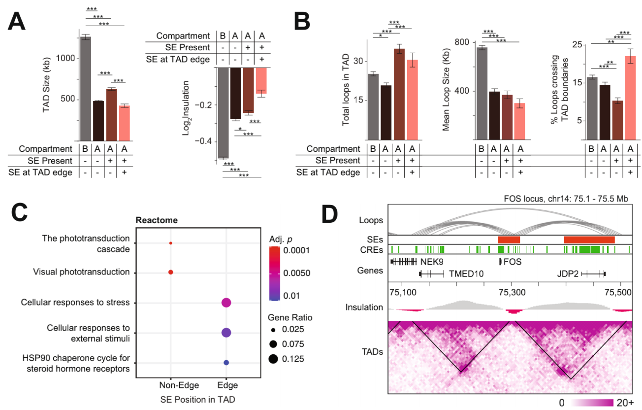 SE靶向基因功能研究,即TSS與SE重疊或相互作用的基因,發(fā)現SE處在邊緣的TAD中都是富含應激反應基因,而視網(wǎng)膜基因主要在SE處于中心的TAD中富集,其中應激反應FOS重疊的SE位于TAD的邊緣,該TAD可能會(huì )受到超出自身TAD邊界的區域變化的影響。