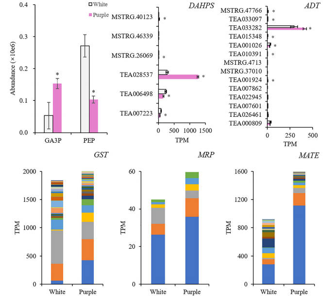 選擇與AP和DpG高度相關(guān)的轉錄因子(TFs),研究它們與差異表達的結構基因的相關(guān)性。結果顯示MYB、AP2/ERF、bZIP、TCP、GATA等基因顯著(zhù)表達,并專(zhuān)注于Phe上游合成基因的調控(DAHPS;和AP(苯乙醛還原酶、短鏈脫氫酶/還原酶)、Dp(F3’H;F3’?5’?H)和DpG(BZ1)的合成,但抑制黃酮(黃酮醇合酶)和兒茶素(白花青素還原酶)的形成。這些結果發(fā)現了紫茶樹(shù)中揮發(fā)性BPs的促進(jìn)作用,擴展了我們對BPs型顏色與香氣關(guān)系的理解。