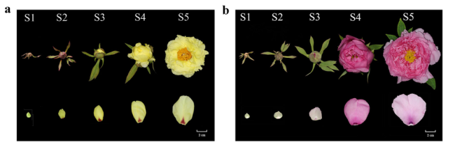 為表征樹(shù)牡丹花色發(fā)育情況,以黃花品種“海黃”和紫紅花品種“肉芙蓉”為研究對象,在花蕾早期至盛開(kāi)的S1-S5共5個(gè)發(fā)育階段對兩個(gè)品種的花瓣組織進(jìn)行了取樣,用于測定花瓣顏色指數,在“海黃”中發(fā)現L *(明度)值從S1到S5逐漸增加,這表示花瓣顏色明度升高。C *(色度)和b *(黃色)在S3達到峰值,隨后在S4和S5下降,證明S3是顏色最黃的階段。而“肉芙蓉”在整個(gè)開(kāi)花過(guò)程中沒(méi)有觀(guān)察到L *的顯著(zhù)變化。在S1到S5階段,“肉芙蓉”中b *顯著(zhù)低于“海黃”。同樣,“肉芙蓉”中a *(紅色)比“海黃”要高得多。