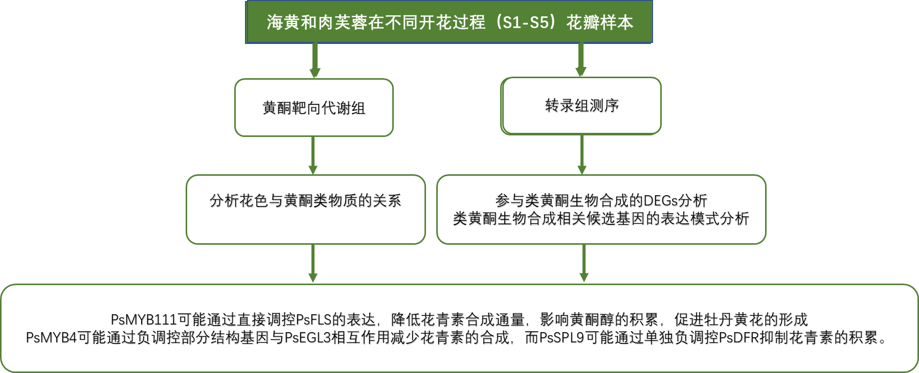 全長(cháng)轉錄組分析結果顯示,“海黃”黃酮類(lèi)生物合成基因在S2階段比“肉芙蓉”表達水平高,分別為PsCHSs和PsCHIs,PsCHS在合成THCs中有重要作用,而PsCHI在黃酮合成過(guò)程中發(fā)揮關(guān)鍵作用,這有助于黃色著(zhù)色,此外,注釋為PsF3Hs的基因也有很高的轉錄水平。在這些基因中,PsFLS可以改變黃酮類(lèi)途徑,以促進(jìn)黃酮醇的合成?!昂|S”和“肉芙蓉”中這些表達的變化與“海黃”中高水平的THC、黃酮和黃酮醇一致。S2 vs?S3階段,發(fā)現“海黃”中PsDFRs和PsUFGTs表達水平顯著(zhù)下調,PsDFR和PsUFGT在花青素合成中起關(guān)鍵作用,如Cy3G,Pn3G和Pg3G的生物合成。因此,PsDFRs和PsUFGTs在“海黃”表達下調可以解釋這種黃色花卉品種中缺乏花青素的產(chǎn)生。