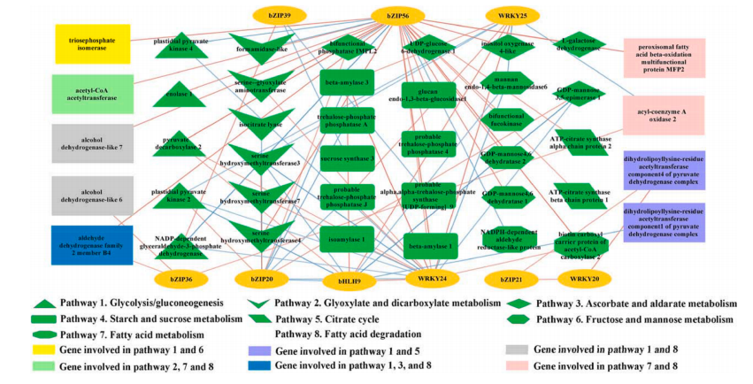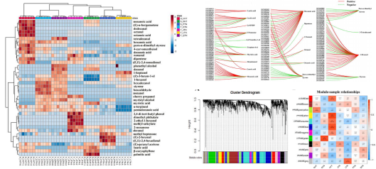 該研究對中國7個(gè)地區突尼斯石榴的代謝組和轉錄組、風(fēng)味相關(guān)屬性和揮發(fā)性化合物進(jìn)行了研究。7個(gè)不同種植區的石榴,糖、有機酸和維生素c含量存在顯著(zhù)差異。所有樣品共鑒定了40種揮發(fā)性化合物,其中13種揮發(fā)性化合物。所有樣品中有4種化合物含量較高,包括1-己醇、(Z)-3-己烯醇、α-松果醇和2,4-二叔丁基苯酚,是影響石榴香氣品質(zhì)的主要貢獻因素。所有樣品的5個(gè)差異積累代謝物,包括棕櫚酸、辛酸、月桂酸、癸酸和肉豆蔻酸,在所有樣品的脂肪酸生物合成中均顯著(zhù)富集。WGCNA分析結果表明42個(gè)候選風(fēng)味相關(guān)差異表達基因和9個(gè)轉錄因子主要位于3個(gè)關(guān)鍵模塊中。己烷酸是一種重要的代謝物,與38個(gè)差異表達基因顯著(zhù)相關(guān)。本研究構建了復雜的調控網(wǎng)絡(luò ),以確定調控石榴中揮發(fā)性化合物代謝的結構基因和轉錄因子,發(fā)現bZIP56、bZIP56、bZIP20、WRKY24和bHLH9在石榴果皮的風(fēng)味代謝調控中起重要作用。