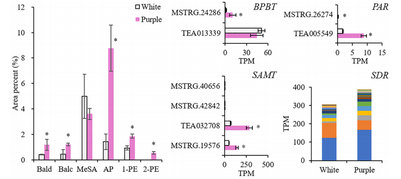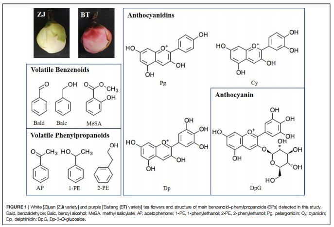 山茶花的花通常是白色的,葉片是紫色的,研究發(fā)現了一種特殊的品種,葉子和花都是紫色的,而研究者通常關(guān)注顏色形成的機制,而忽略了香氣的變化。紫茶樹(shù)含有更多的花青素,屬于黃酮類(lèi)化合物。同時(shí),由莽草酸途徑衍生的苯丙氨酸(Phe)是黃酮類(lèi)化合物和揮發(fā)性苯類(lèi)苯丙素(BPs)的前體。因此,目前尚不清楚BP的香氣是否因紫色的出現而減弱。