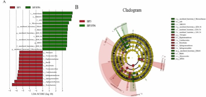 LDA值分布柱狀圖(上),LEfSe分析進(jìn)化分枝圖(下)