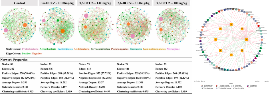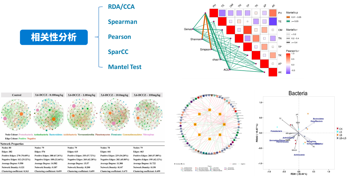 相關(guān)性網(wǎng)絡(luò )分析:網(wǎng)絡(luò )圖是相關(guān)性分析的一種表現形式,根據各個(gè)物種在各個(gè)樣品中的豐度以及變化情況,進(jìn)行斯皮爾曼(Spearman )秩相關(guān)分析并篩選相應條件下的數據構建相關(guān)性網(wǎng)絡(luò )?;诰W(wǎng)絡(luò )圖的分析,可以獲得物種在環(huán)境樣本中的共存關(guān)系,得到物種在同一環(huán)境下的相互作用的情況及重要的模式信息,進(jìn)一步解釋樣本間表型差異的形成機制。