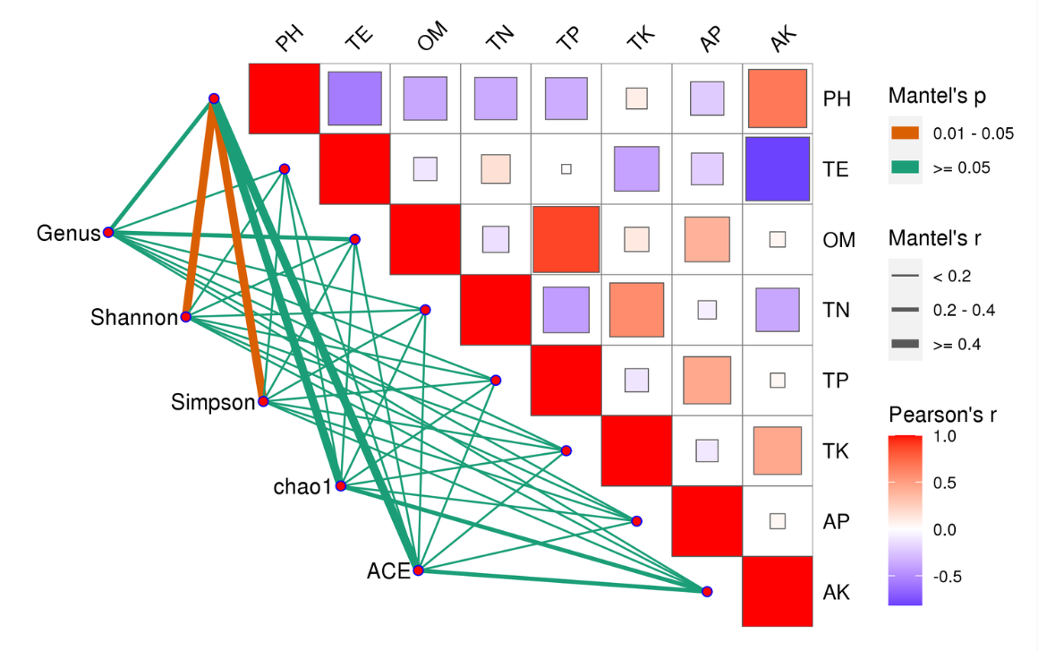 Mantel Test分析:Mantel test 是檢驗兩個(gè)矩陣相關(guān)關(guān)系的非參數統計方法,多用在生態(tài)學(xué)上,用來(lái)檢驗群落距離矩陣(如 Bray-Curtis distance matrix)和環(huán)境變量距離矩陣(即環(huán)境因子指標)之間的相關(guān)性。其可以得到特征與環(huán)境因子之間的mantel test的r值和p值。
