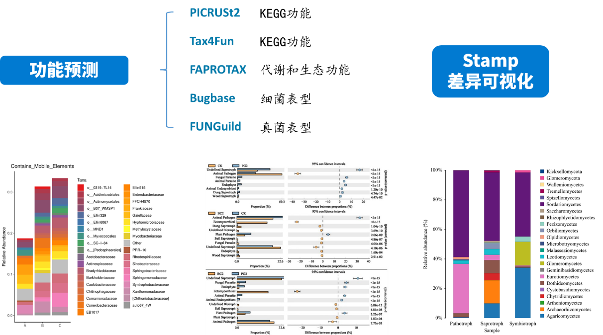 PICRUSt 2 將特征序列(16S rRNA)與微生物基因組數據庫(IMG,Integrated Microbial Genomes)參考序列對齊(aliign)構建進(jìn)化樹(shù),找到特征序列的“最近物種”,并根據已知物種的基因種類(lèi)和豐度信息預測未知物種的基因信息,從而結合基因的KEGG通路信息預測整個(gè)群落的通路情況。通過(guò)組間差異分析,得到在組間具有顯著(zhù)差異的功能,最后利用Stamp對結果進(jìn)行差異可視化。