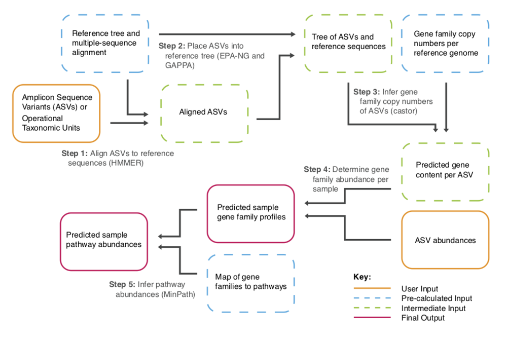 PICRUSt2 (Phylogenetic Investigation of Communities by Reconstruction of Unobserved States)是一款基于樣本中的標記基因序列豐度來(lái)預測樣本功能豐度的軟件。這里的功能是指基因家族,如KEGG同源基因、EC酶分類(lèi)號等,其原理如下圖: